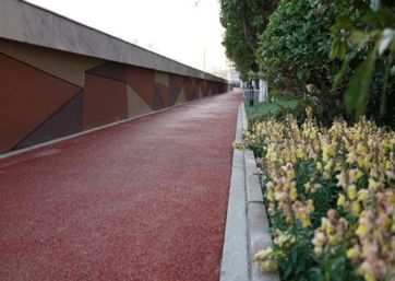 经过透水铺装的海绵化改造后,雨水能够快速渗入地下,有效地消纳地表径流。改造后的广场中心在地面和环廊墙面的设计上更具活力;环廊顶部还增加蓝色隔音屏降噪。