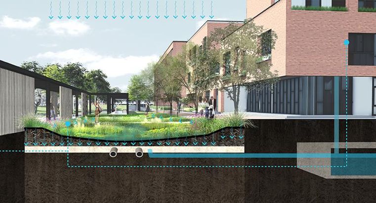 雨水花园作为绿化生态蓄滞区,是自然形成或人工挖掘形成的浅凹绿地。由树皮或植被作为覆盖,实现蓄水、净水和收集雨水的功能。