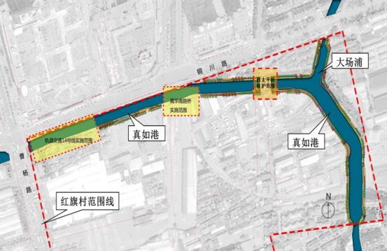 普陀区红旗村范围内真如港总长度965.41m,整治河道总长680.66m。