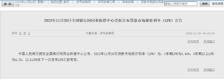11月20日,中国人民银行授权全国银行间同业拆借中心公布,2023年11月20日贷款市场报价利率(LPR)为:1年期LPR为3.45%,5年期以上LPR为4.2%。与上月相比,11月1年期、5年期以上LPR均维持不变。