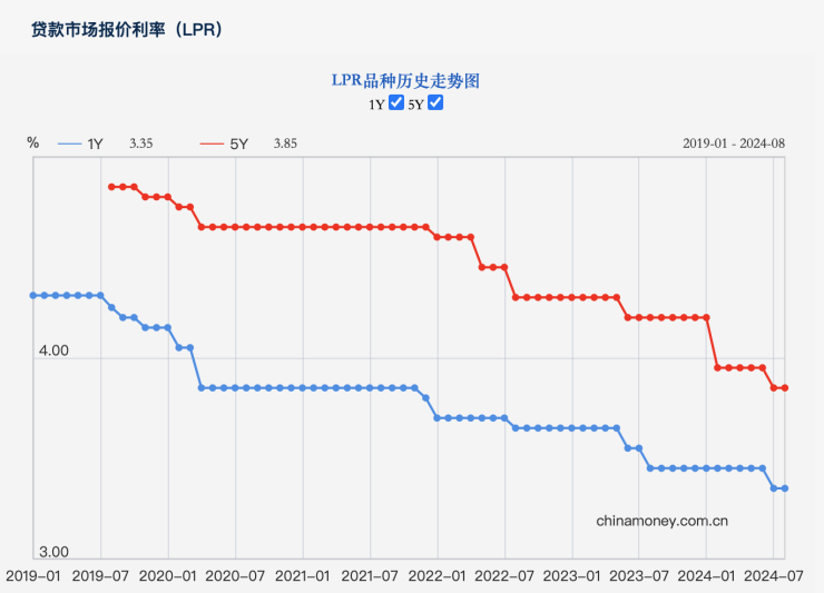 2024年8月20日贷款市场报价利率(LPR)为:1年期LPR为3.35%,5年期以上LPR为3.85%,均与前一期持平。以上LPR在下一次发布LPR之前有效。