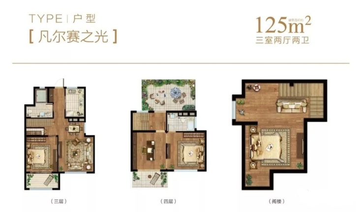 125平上叠:该户型多开间朝南,南北通透;而且南向面宽为7.5米左右,采光较好。三层规划为餐厅、客厅等生活空间以及老人房(或者客房),方便老人日常起居。四层规划为主卧空间,享有独立卫浴,私人书房;另外南北均有阳台或露台设计,视野更佳。