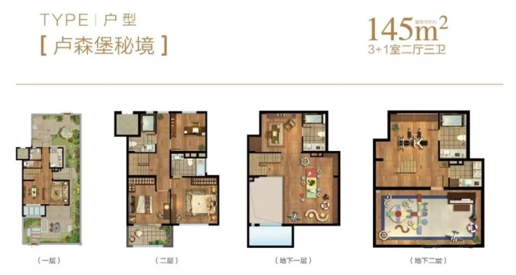 145平下叠:这个户型做到了约5.4米双层挑高地下空间,可以打造成儿童娱乐空间或家庭多功能室。一楼为活动空间,二楼为休憩空间,动静分区明显。此外,每一层均配备卫生间,为家人提供了更便捷的生活体验。