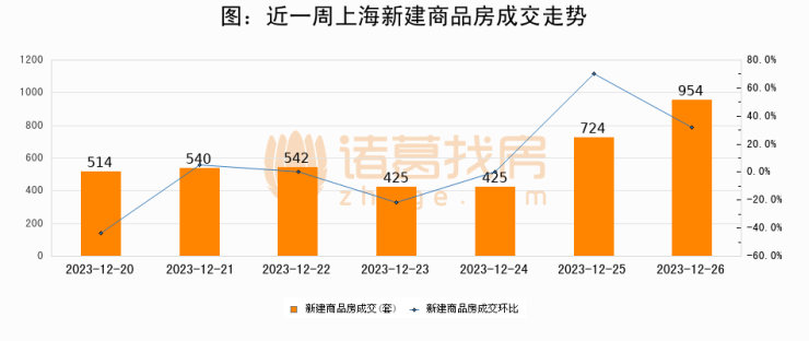 根据上海市房地产交易中心数据显示,2023年12月26日上海新建商品房成交954套,较昨日增加230套,环比上涨31.8%