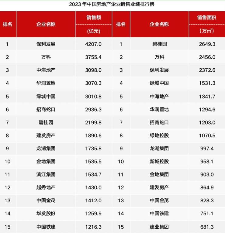 据中指研究院统计的房企销售排行榜显示,2023年房企销售额TOP10分别是保利发展、万科、中海地产、华润置地、绿城中国、招商蛇口、碧桂园、建发房产、龙湖集团和金地集团。对比1-11月,绿城中国与招商蛇口互换位置,其余房企位次不变。