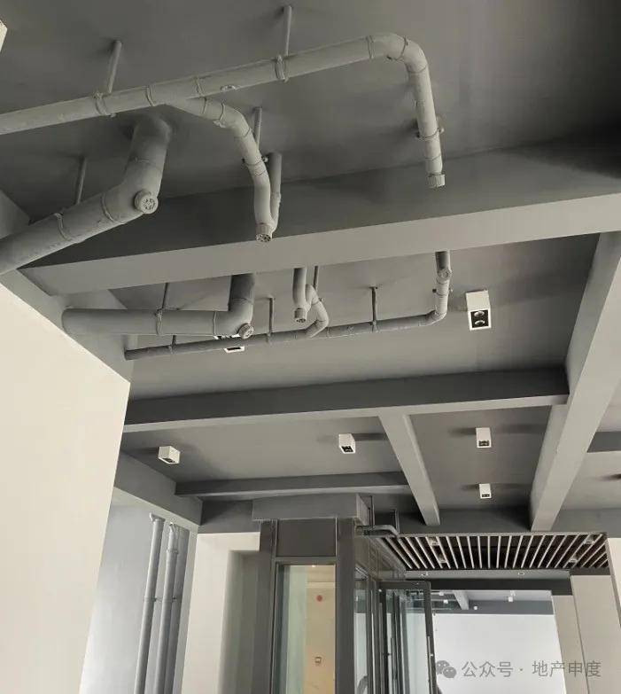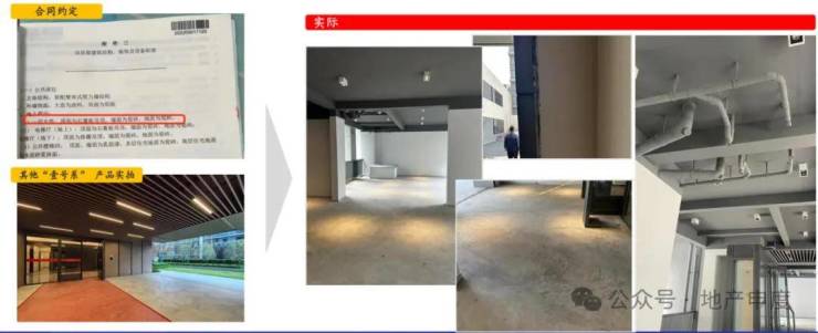 业主透露,在《预售合同》明确约定“一层大堂:顶面为石膏板吊顶、墙面为瓷砖、地面为瓷砖”,现在 的架空层无吊顶,各种管道外漏、前面是参差不齐的涂料、地面是水泥地。