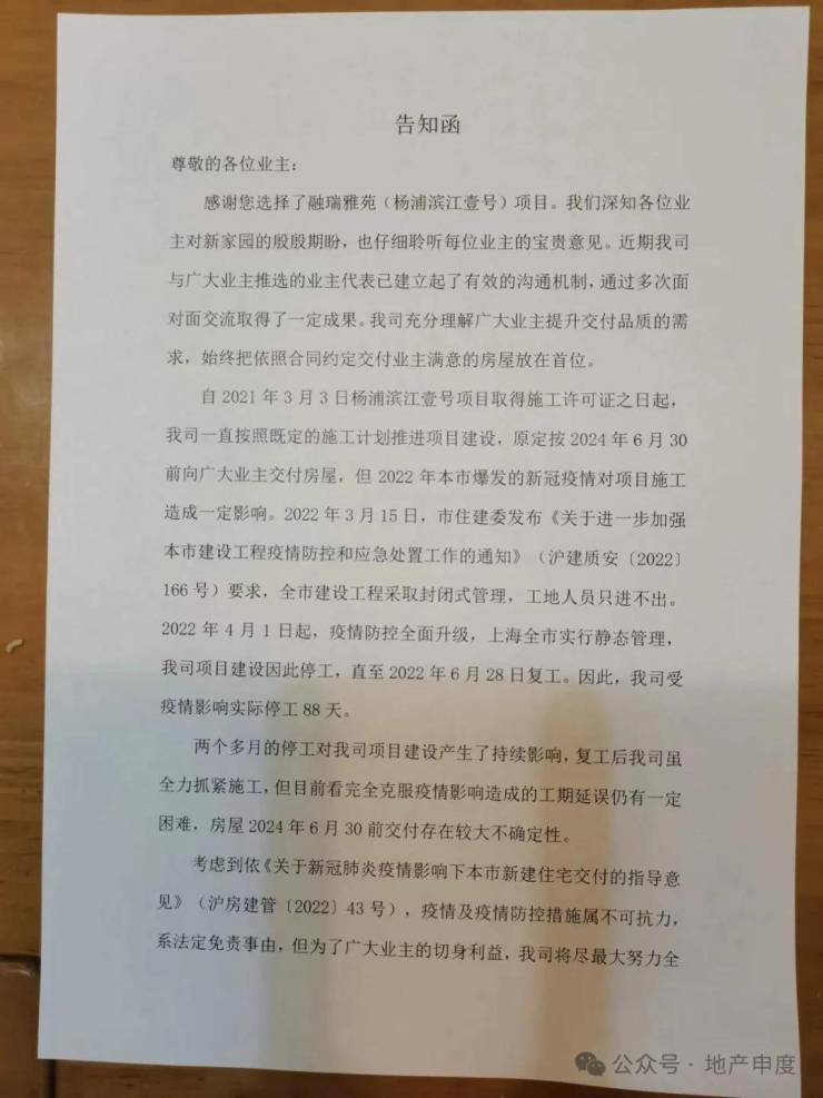 据业主陈静透露的最新消息获悉,项目整改还没到位。开发商发出了延期交付的告知函,但给出的理由却是疫情原因。这让业主们更加无法接受,毕竟等待交房已经2年多,比同期认筹的楼盘(龙光天境2023年12月底交付)已经晚了一段时间。