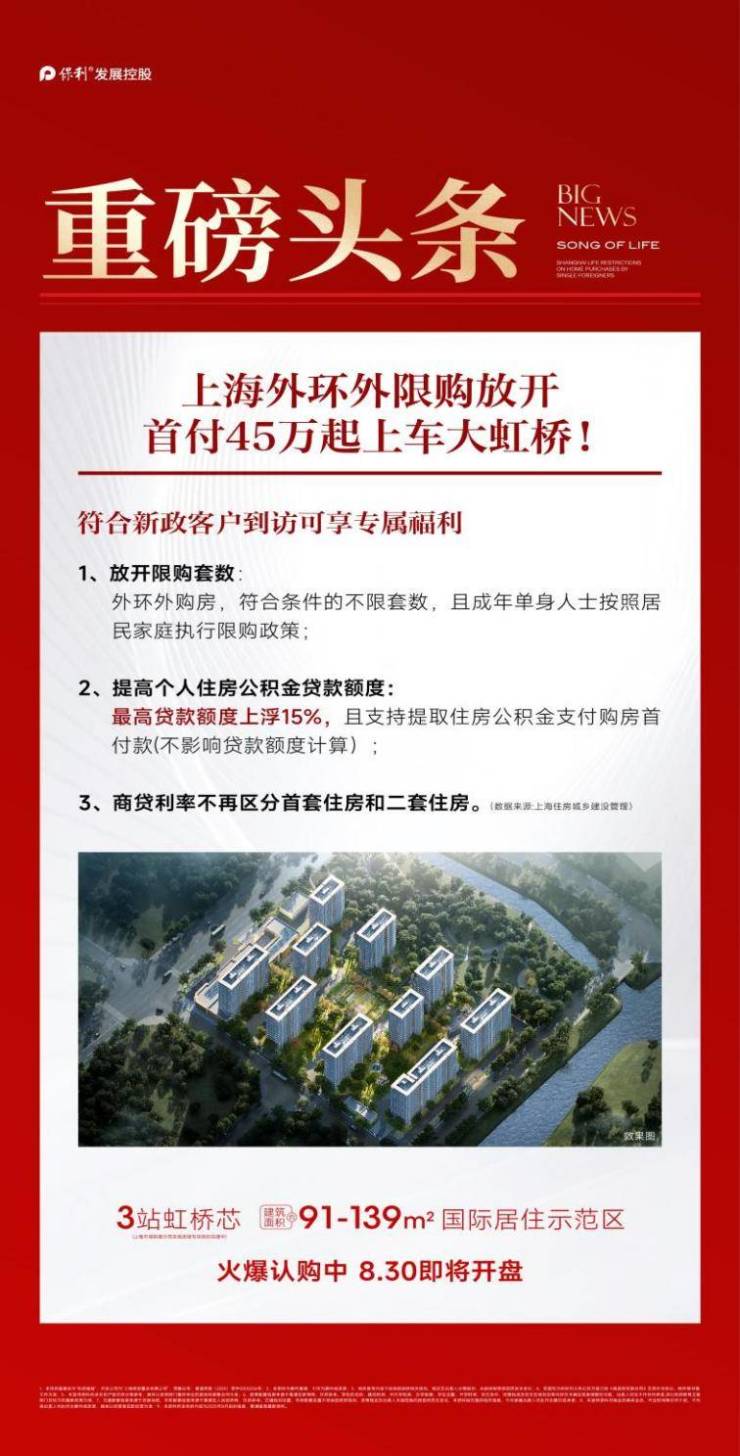 8月25日,上海官宣外环外限购取消,政策闸门一开,让本就聚焦无数目光的大虹桥,瞬间涌入大批购房者,尤其首付45万起的保利虹桥和颂三期,成了外环外置业必看焦点。8月30 号开盘,好楼层先到先得,此刻犹豫手慢即无。(信息来源:人民日报)