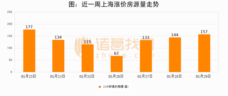 根据诸葛找房数据显示,上海24小时涨价房源量为157套,较05月28日增加13套,环比上涨9%。与此同时,涨价房源占比小幅扩大,业主信心有所提升。