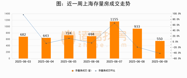 从存量房来看,2025年06月09日上海存量房单日成交550套,比昨日减少383套,环比下降41%。从近一周存量房成交来看,上海存量房日均成交套数为768套,06月09日单日成交550套,低于近一周平均水平28.4%。