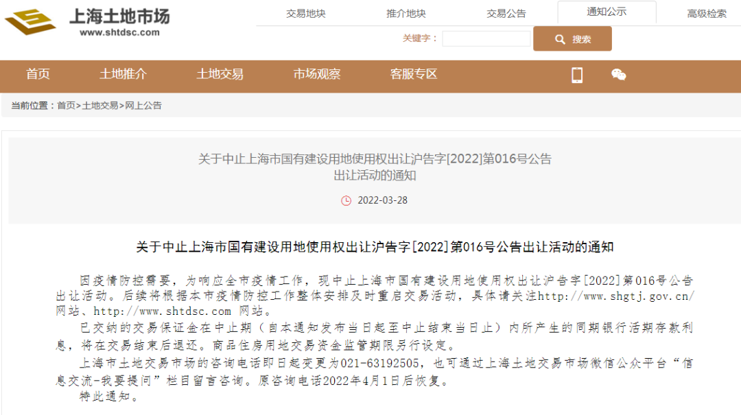 因疫情防控需要,为响应全市疫情工作,现中止上海市国有建设用地使用权出让沪告字[2022]第016号公告出让活动。后续将根据本市疫情防控工作整体安排及时重启交易活动。此外,通知也明确,已交纳的交易保证金在中止期(自本通知发布当日起至中止结束当日止)内所产生的同期银行活期存款利息,将在交易结束后退还。