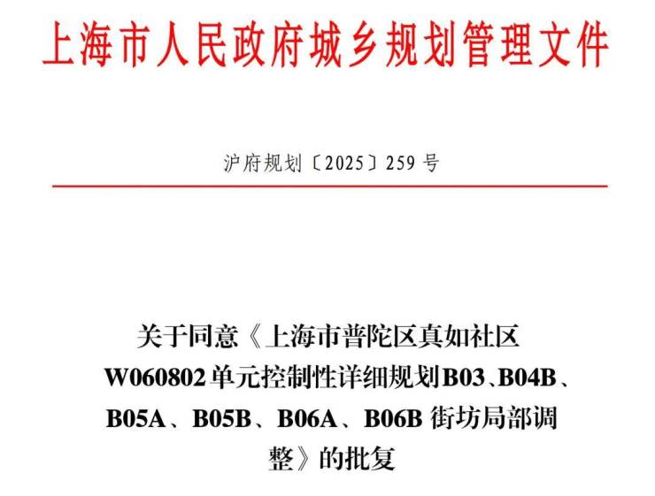 近日,普陀区真如社区W060802单元控制性详细规划B03、B04B、B05A、B05B、B06A、B06B街坊局部调整方案正式获批,将新增超过18万平方米住宅并建设一座220米高的地标塔楼。