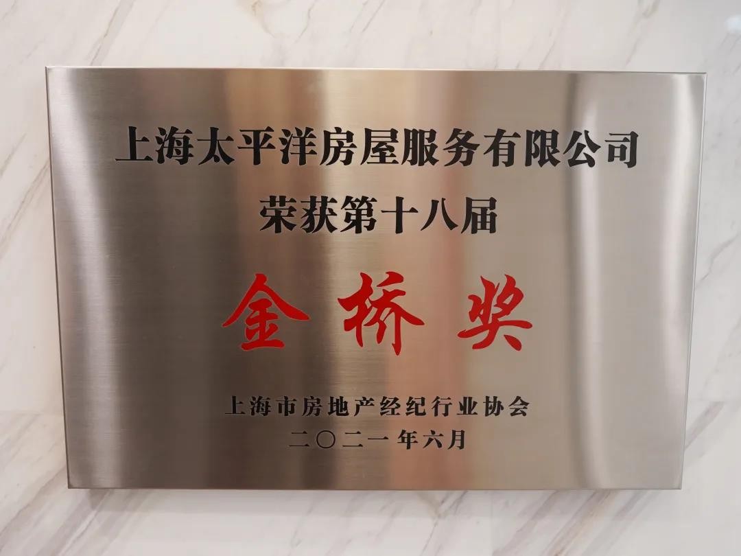 2021年7月8日,上海房地产经纪行业协会第十八届“金桥奖”颁奖典礼在房地大厦隆重召开。太平洋房屋再次荣获“房屋中介企业”金桥奖,这也是太平洋房屋第十八次蝉联该项奖项。