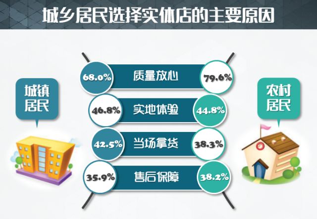 在新兴消费领域不断涌现的同时,传统消费领域也开始焕发出新的活力,人们开始更倾向于追求消费的多样性、体验性等品质。同时,线下实体店相较线上渠道的品质和体验优势也得到相当认同,城乡居民均表示选择实体店的原因主要是质量放心、实地体验、当场拿货和售后保障。其中,农村居民相对看重实体店的商品服务的品质,选择质量和售后保障的占比分别比城镇居民高11.6个和2.3个百分点;城镇居民则相对重视实体店的消费体验过程,选择当场拿货和实地体验的占比分别比农村居民高4.2个和2.0个百分点;此外,城镇居民在实体店体验后进行线上购物的比例也比农村居民高10.3个百分点。