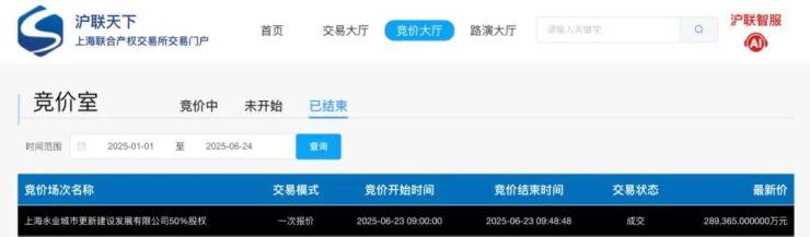 6月18日,永业集团正式披露了上海永业城市更新建设发展有限公司50%股权的转让交易信息:转让底价28.9365亿元,对应约205.7亿总资产的约50%,约103亿元(含负债)。