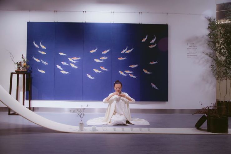 在布展人隋欣的指引下,我们才从刚刚的“憧憬”中回到现实,得到了展厅的正确“打开方式”——从正门进入,茶席上早已备好香茗,入座后品茗对谈,待心沉静,随后起身欣赏空间内的作品:隋欣的刺绣,青年花道艺术家刚子的插花,感受完视觉元素后,移步到香席,在一片竹林旁亲嗅香学艺术家罗子杰调制的香,耳畔伴有青年古琴演奏家晏兮的琴音。