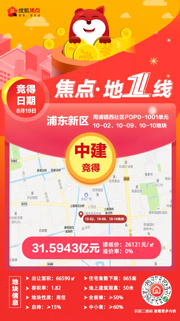 上海中建康桥投资发展有限公司(中建+康桥实业发展)以31.5943亿元竞得浦东新区周浦镇西社区PDP0-1001单元10-02、10-09、10-10地块,折合楼板价26121元/㎡,零溢价。
