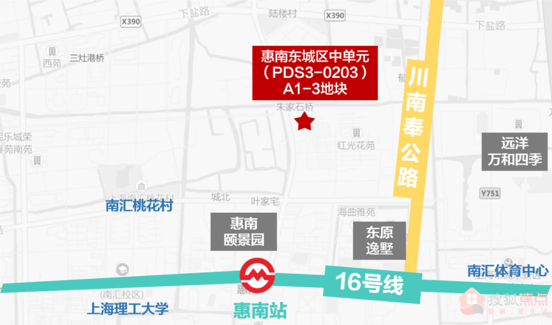 配套方面, 该地块靠近川南奉公路,距16号线惠南站直线距离约1.5公里,出行较为便捷。项目周边还有上海理工大学、南汇体育中心、南汇桃花村等教育、文娱配套。