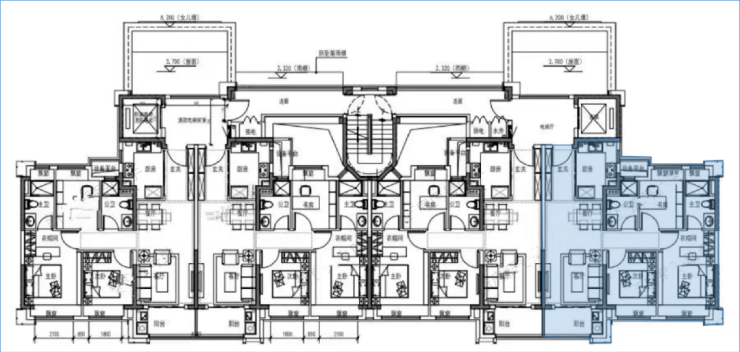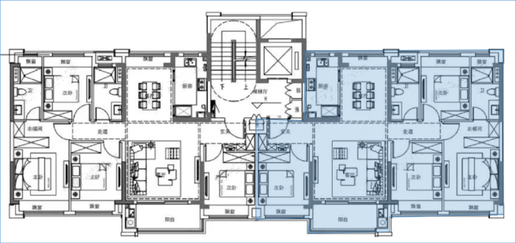 项目主力户型为建面约100㎡3房,2梯4户带连廊。其中3#、1#为大户型,约40套。