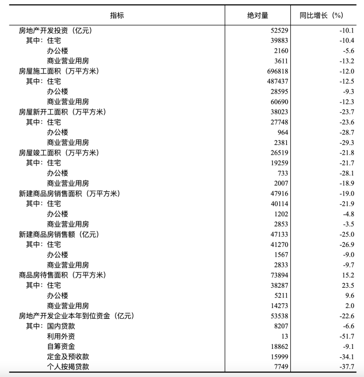 1—6月份,房地产开发企业房屋施工面积696818万平方米,同比下降12.0%。其中,住宅施工面积487437万平方米,下降12.5%。房屋新开工面积38023万平方米,下降23.7%。其中,住宅新开工面积27748万平方米,下降23.6%。房屋竣工面积26519万平方米,下降21.8%。其中,住宅竣工面积19259万平方米,下降21.7%。