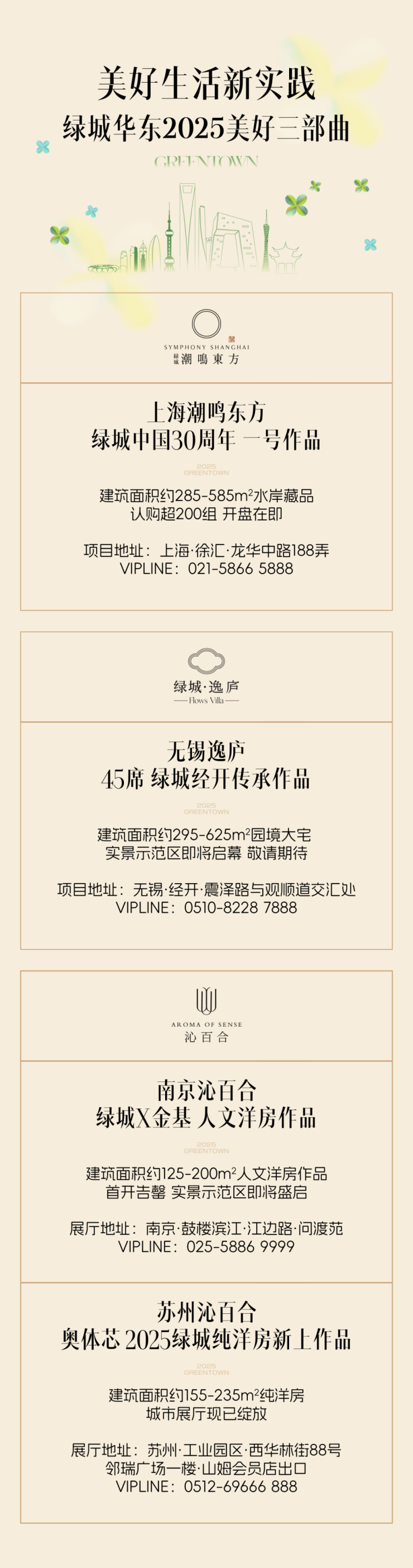 在绿城华东10城,美好亦如潮不息,每一次都以产品的进化与生活的创造,向城市致以崇高的敬意。伴随新品「上海潮鸣东方、无锡逸庐、南京沁百合」的热映,“潮鸣、庐系、百合”也将绿城华东2025美好三部曲奏响。