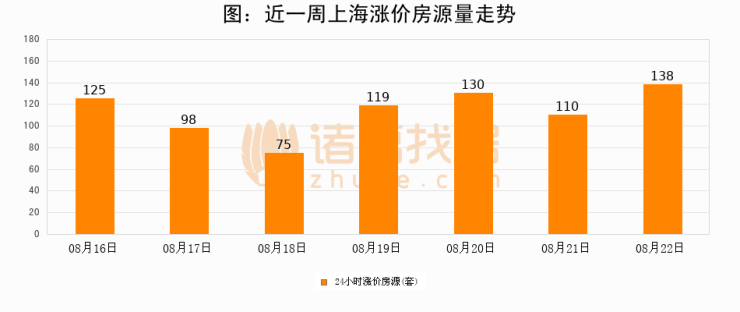 根据诸葛找房数据显示,上海24小时涨价房源量为138套,较08月21日增加28套,环比上涨25.5%。与此同时,涨价房源占比小幅扩大,业主信心有所提升。