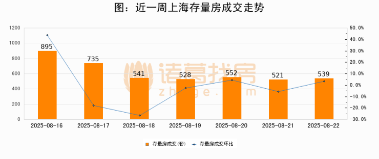 从存量房来看,2025年08月22日上海存量房单日成交539套,比昨日增加18套,环比上涨3.5%。从近一周存量房成交来看,上海存量房日均成交套数为615套,08月22日单日成交539套,低于近一周平均水平12.4%。