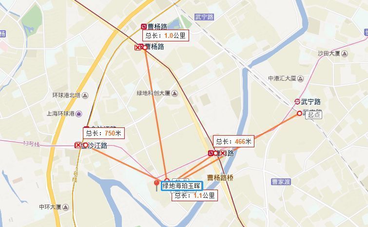 距离14号线(在建)大世界站1.2公里,距离3/4号线曹杨路站1公里,分别距离13号线金沙江路、隆德路750米和466米。