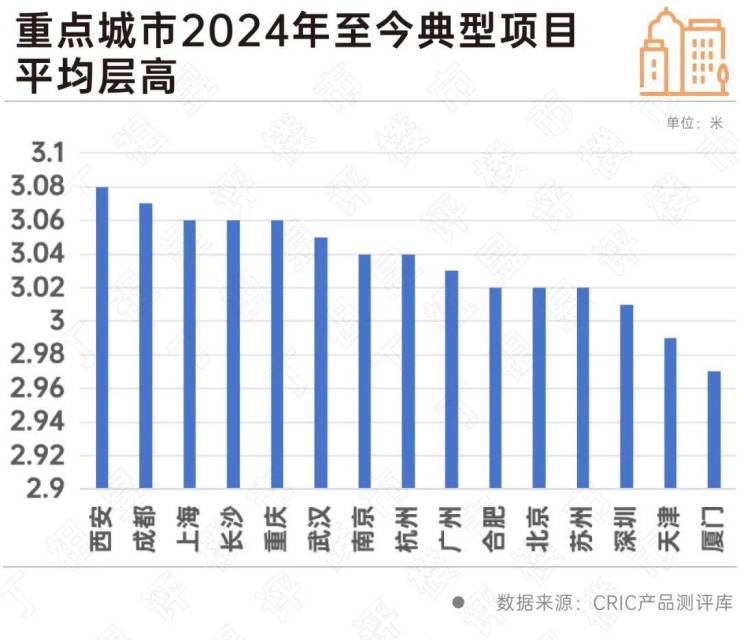 聚焦到关注度最高的层高来看,据CRIC产品测评库不完全统计,15个重点城市(北京、上海、广州、深圳、杭州、合肥、厦门、南京、武汉、苏州、天津、西安、成都、长沙、重庆)2024年至今6268个典型项目平均层高已达3.04米。