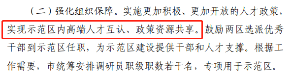 文件提到,示范区内高端人才互认,政策资源互享,这意味着,片区享受园区政策资源,符合条件的居民,将更大化的享受园区配套、政策等。
