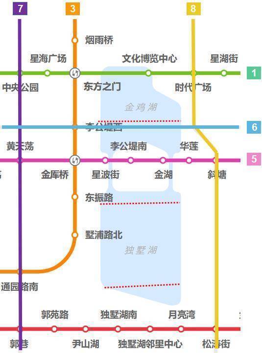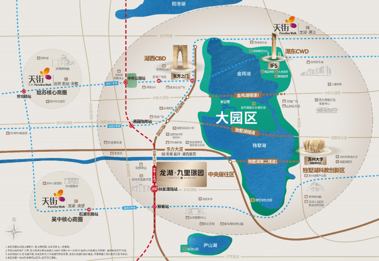 湖西中央生活居住区,纵向有3号线与湖西无缝对接,横向有1号线、2号线分别与湖东、独墅湖高教区相连,还有独墅湖第二隧道、金鸡湖隧道,通达双湖内外。