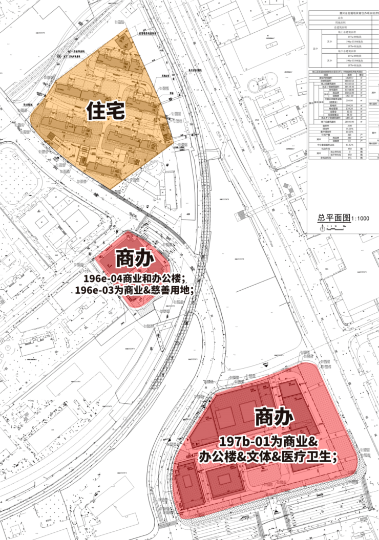 地块为商住办综合用地,出让面积48122㎡,由4幅子地块组成,且并不相邻。其中,197a-09地块为商品房用地,位于最北侧;196e-03、196e-04为商办用地,位于中间位置;197b-01地块为商业用地,位于南侧。