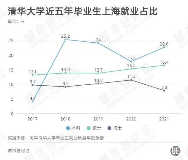 而清华大学2018、2019年的数据,尤其是本科毕业生流向上海的数据,抬升更是明显:直接从2017年的4.1%,飙升至2018年的25.2%。