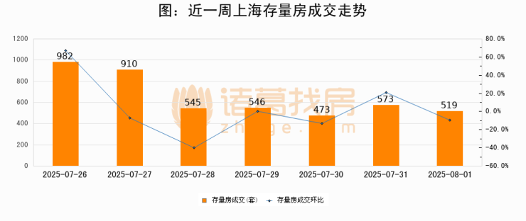 从存量房来看,2025年08月01日上海存量房单日成交519套,比昨日减少54套,环比下降9.4%。从近一周存量房成交来看,上海存量房日均成交套数为649套,08月01日单日成交519套,低于近一周平均水平20%。