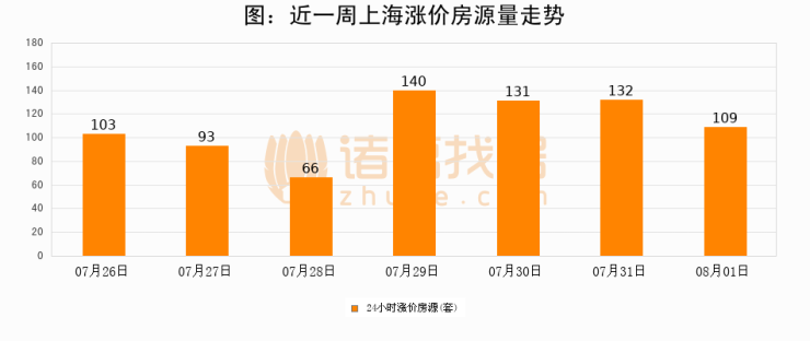 根据诸葛找房数据显示,上海24小时涨价房源量为109套,较07月31日减少23套,环比下降17.4%。与此同时,涨价房源占比小幅回落,对于购房者来说是一个入市窗口期,购房者可抓住时机入市。