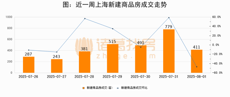【上海成交日报】08月01日新房成交411套、二手房519套;涨价房源109套