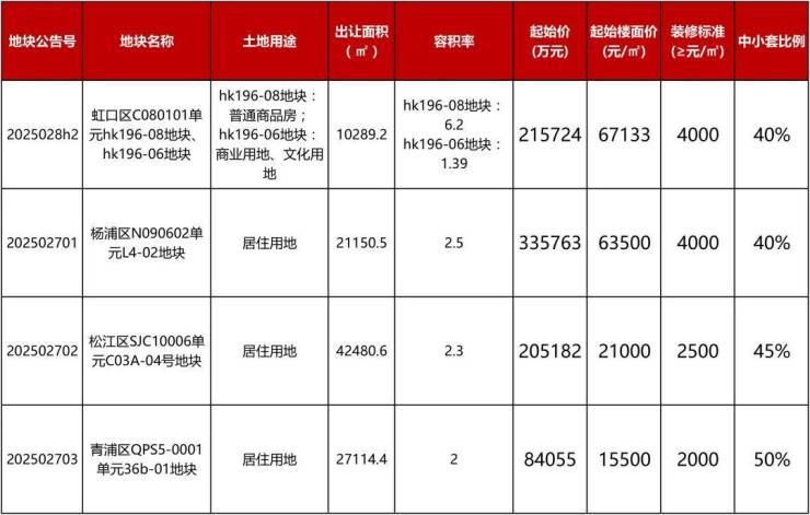 上海2025年四批次土拍已于日前正式发布出让公告,共推出4宗涉宅地块,分布于虹口四川北路、杨浦滨江、松江新城、青浦重固。总出让面积10.1万㎡,总起始价84.0724亿元。