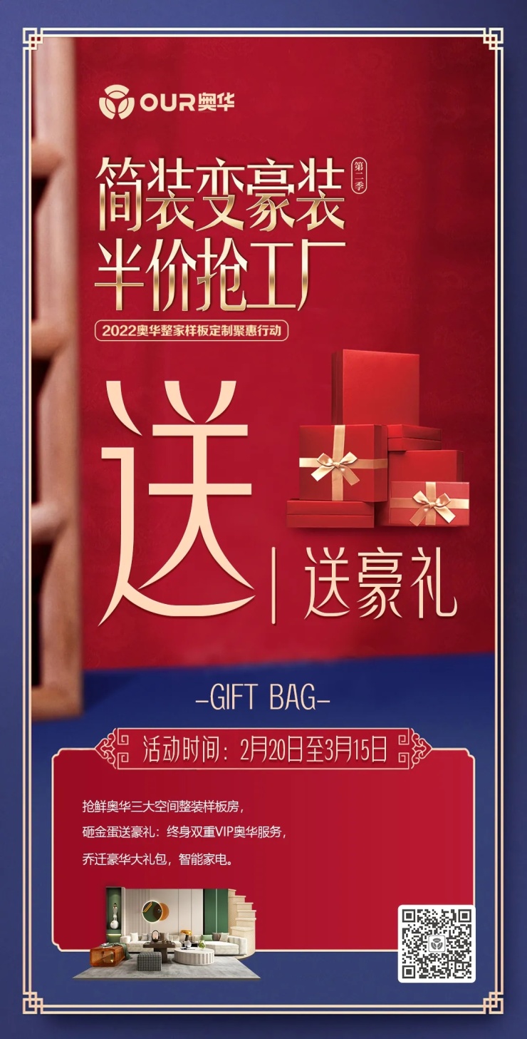 奥华简装变豪装·半价抢工厂第2季,送乔迁豪华大礼包,抢鲜奥华三大空间整装样板房,砸金蛋送豪礼,可享终生双重VIP服务。
