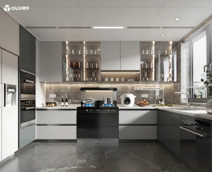 厨房整体是“U”形设计,大板吊顶结合电器,优质隐藏,做饭动线非常流畅,环境整洁。