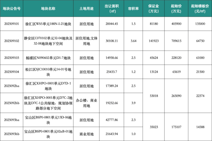 此次共推出6幅涉宅地块,分布在徐汇、静安、杨浦、宝山、松江等区域,总出让面积约19.2万平方米,总起拍价达184.95亿元,将于10月20日正式开拍,同一天全部出让。