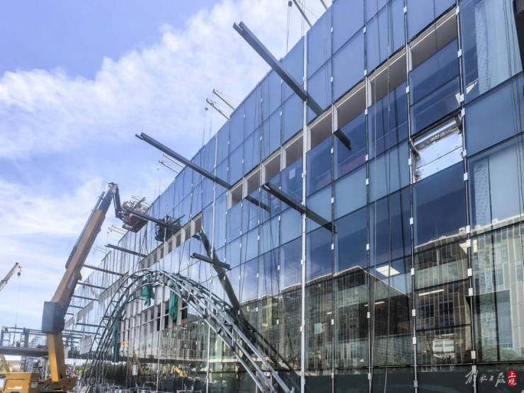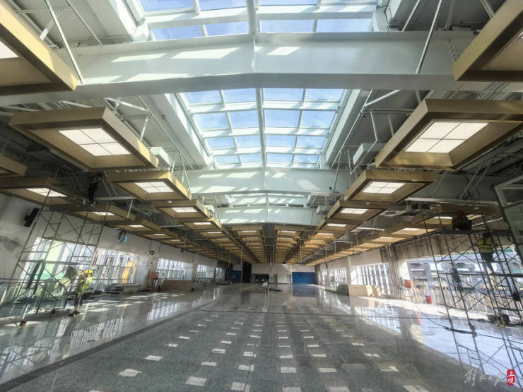 2024年7月22日,施工人员在位于闵行区的机场联络线一座车站内,进行内部装饰和外幕墙施工。