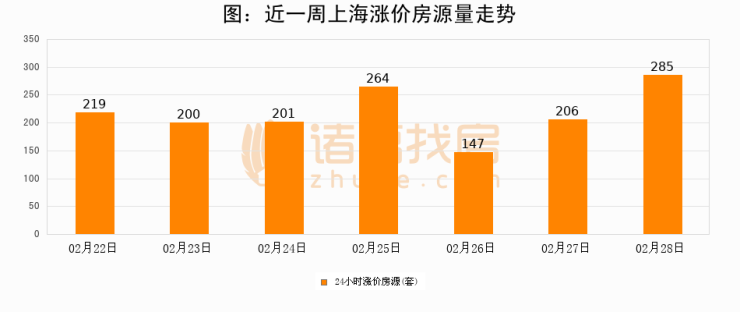 根据诸葛找房数据显示,上海24小时涨价房源量为285套,较02月27日增加79套,环比上涨38.3%。与此同时,涨价房源占比小幅扩大,业主信心有所提升。
