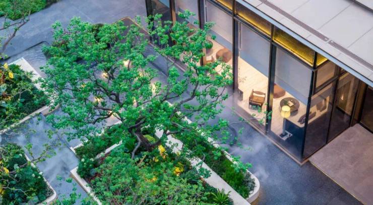 7号楼架空层以“睦邻空间”为定位,设置无界交融过厅、冥想区与花木小庭,在都市中营造一片自然绿洲;