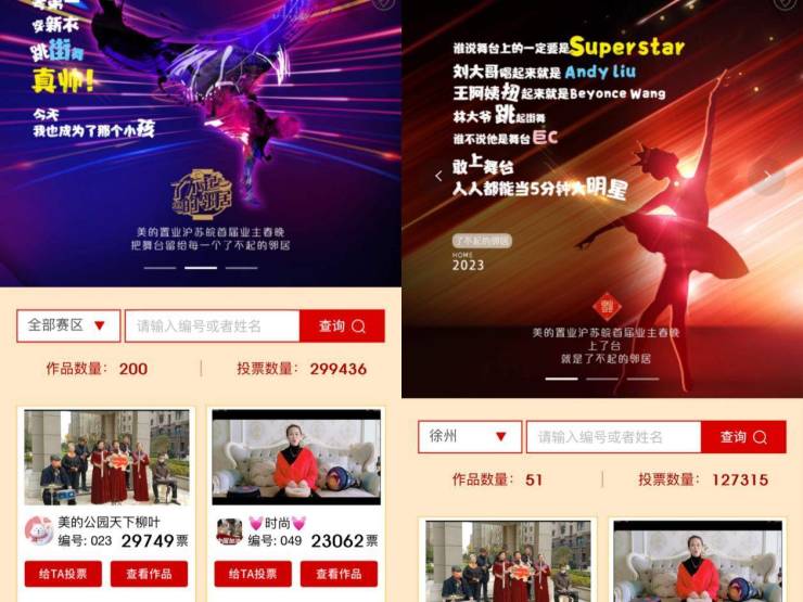 12月10日,美的置业沪苏皖首届业主春晚海选以200组业主报名的作品量,正式进入投票阶段,截止目前,参与投票总数高达29万人次,徐州美的公园天下退休老业主们表演的合唱节目《我爱你中国》以29749的总票数遥遥领先,而手鼓节目《心灵的故乡》则以23062的总票数紧随其后,五大赛区选手以多种表演形式展示新时代下的社区新生活。