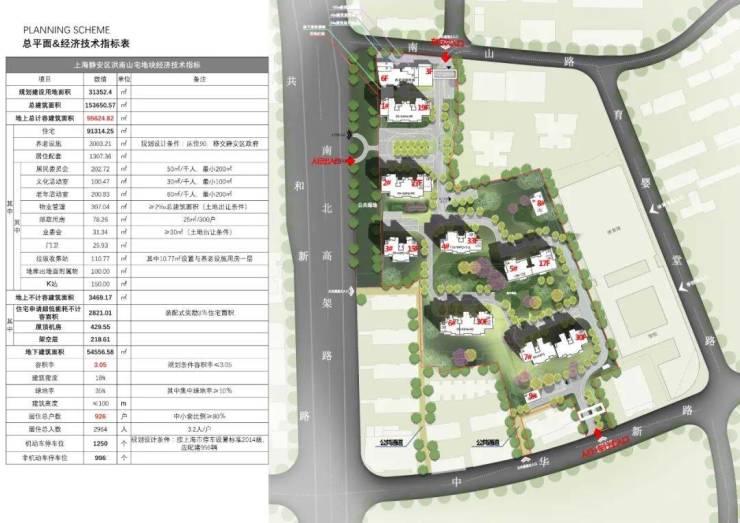 根据设计方案显示,该地块共规划了7幢层高在15-33层不等的高层,其中1号楼19,2号楼27层(局部24层),3号楼15层,4号楼33层,5号楼17层,6号楼为30层(局部20层),7号楼30层。而北侧靠近南山路一侧还规划一幢最高6层的养老设施用房。在小区南北两侧的中华新路和南山路分别设有机动车出入口。