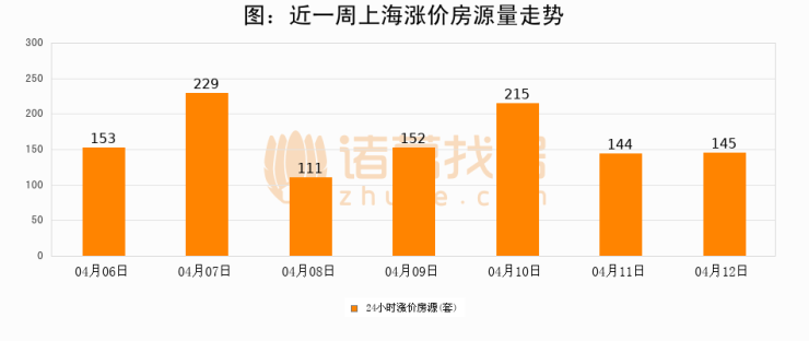 根据诸葛找房数据显示,上海24小时涨价房源量为145套,较04月11日增加1套,环比上涨0.7%。与此同时,涨价房源占比小幅扩大,业主信心有所提升。