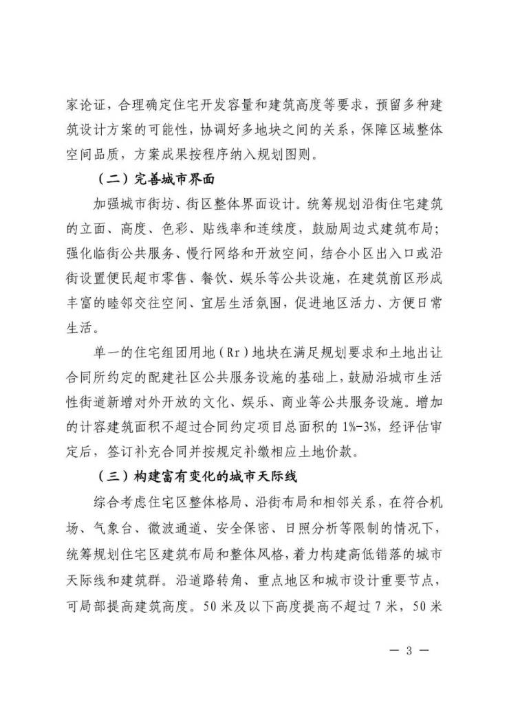 单一的住宅组团用地(Rr)地块在满足规划要求和土地出让合同所约定的配建社区公共服务设施的基础上,鼓励沿城市生活性街道新增对外开放的文化、娱乐、商业等公共服务设施。增加的计容建筑面积不超过合同约定项目总面积的 1%-3%,经评估审定后,签订补充合同并按规定补缴相应土地价款。