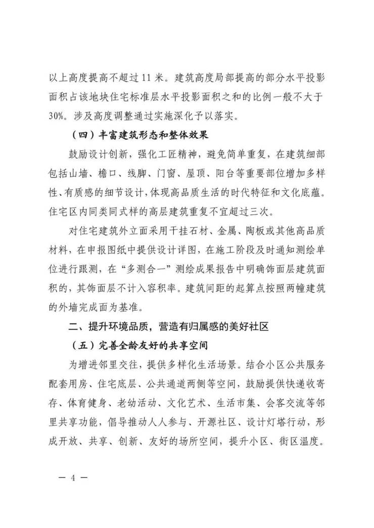 沿道路转角、重点地区和城市设计重要节点,可局部提高建筑高度。50 米及以下高度提高不超过 7 米,50 米以上高度提高不超过 11 米。建筑高度局部提高的部分水平投影面积占该地块住宅标准层水平投影面积之和的比例一般不大于30%。涉及高度调整通过实施深化予以落实。