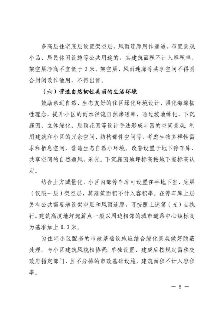 多高层住宅底层设置架空层、风雨连廊用作通道、布置景观小品、居民休闲设施等公共用途的,其建筑面积不计入容积率。架空层净高不宜低于3 米。架空层、风雨连廊等共享空间不得围合封闭改作他用,不得出售。