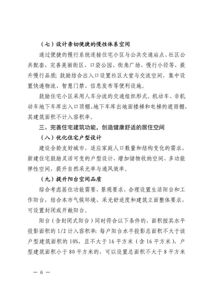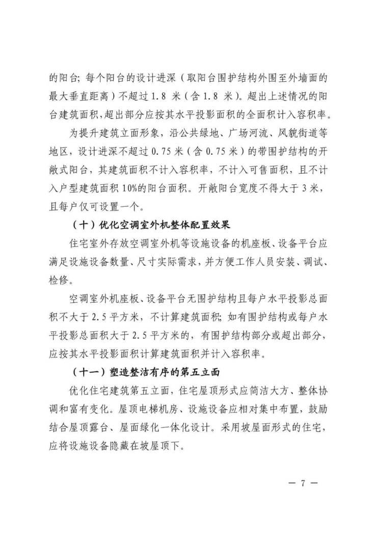 为提升建筑立面形象,沿公共绿地、广场河流、风貌街道等地区,设计进深不超过 0.75 米(含 0.75 米)的带围护结构的开敞式阳台,其建筑面积不计入容积率,不计入可售面积,且不计入户型建筑面积 10%的阳台面积。开敞阳台宽度不得大于3 米,且每户仅可设置一个。